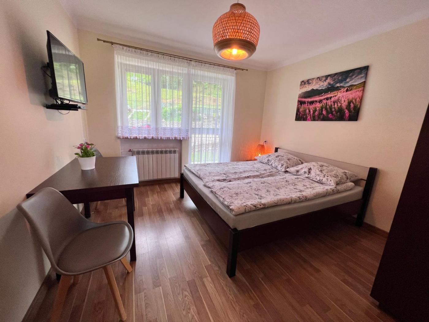 Apartament z widokiem na góry. This apartment comes with 2 bedrooms, a kitchen and 1 bathroom with a shower and a hairdryer. In the kitchen, guests will find a refrigerator, kitchenware, a microwave and an electric kettle. Boasting a balcony with mountain views, this apartment also features a wardrobe and a flat-screen TV with satellite channels. The unit has 3 beds. Apartament - 4 osobowy. Powierzchnia pokoju ok.: 46 mkw. ;