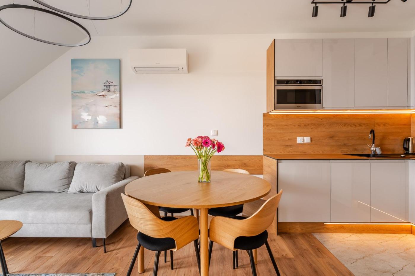 M29 Apartment with bedroom and kitchenette. Boasting a private entrance, this air-conditioned apartment includes 1 living room, 1 separate bedroom and 1 bathroom with a walk-in shower and a hairdryer. In the kitchen, guests will find a stovetop, a refrigerator, a dishwasher and kitchenware. Featuring a balcony with city views, this apartment also offers a washing machine and a flat-screen TV with cable channels. The unit has 2 beds. Apartament - 4 osobowy. Powierzchnia pokoju ok.: 35 mkw.